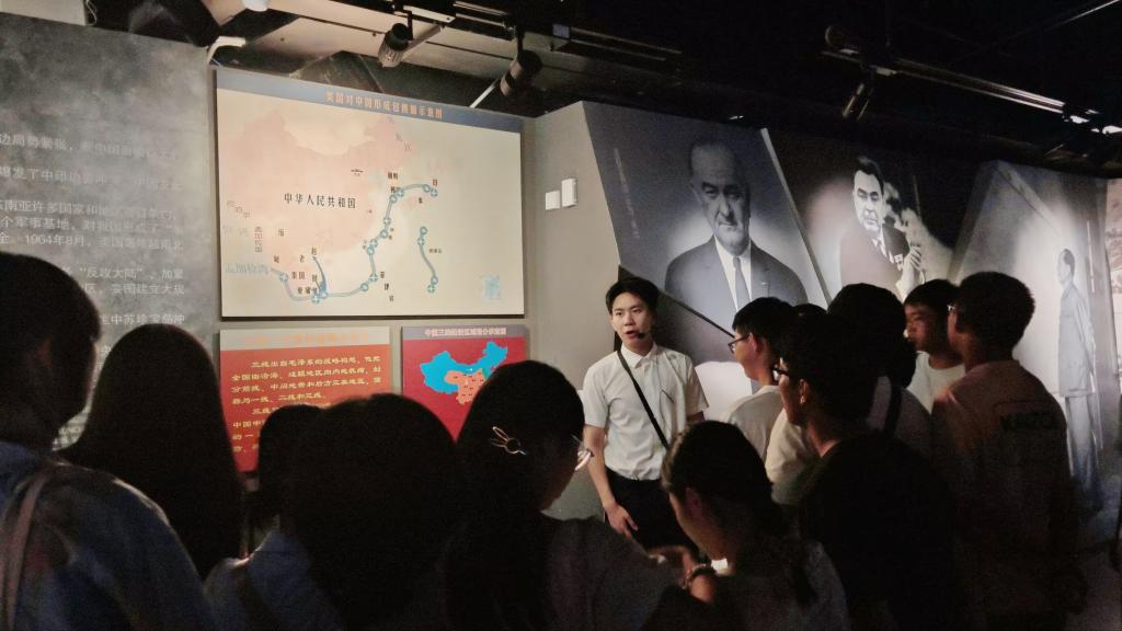 活动期间,新生们以班级为单位自由参观,沿着展厅脉络自主探索三线建设的壮阔历程。从记录荒滩建厂的黑白照片、锈迹斑斑却仍显厚重的机床设备,到还原建设者“干打垒”宿舍的生活场景,一件件实物与文献资料,让大家直观感受到当年建设者“三块石头架口锅,帐篷搭在山窝窝”的艰苦创业场景。面对8米高的三线建设者浮雕墙,新生们自发驻足凝视,轻声交流着对“艰苦创业、无私奉献”等精神内涵的理解,不少人还通过手机查询展品背后的英模故事,在自主探寻中加深对历史的认知。
