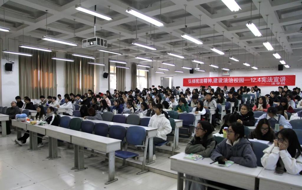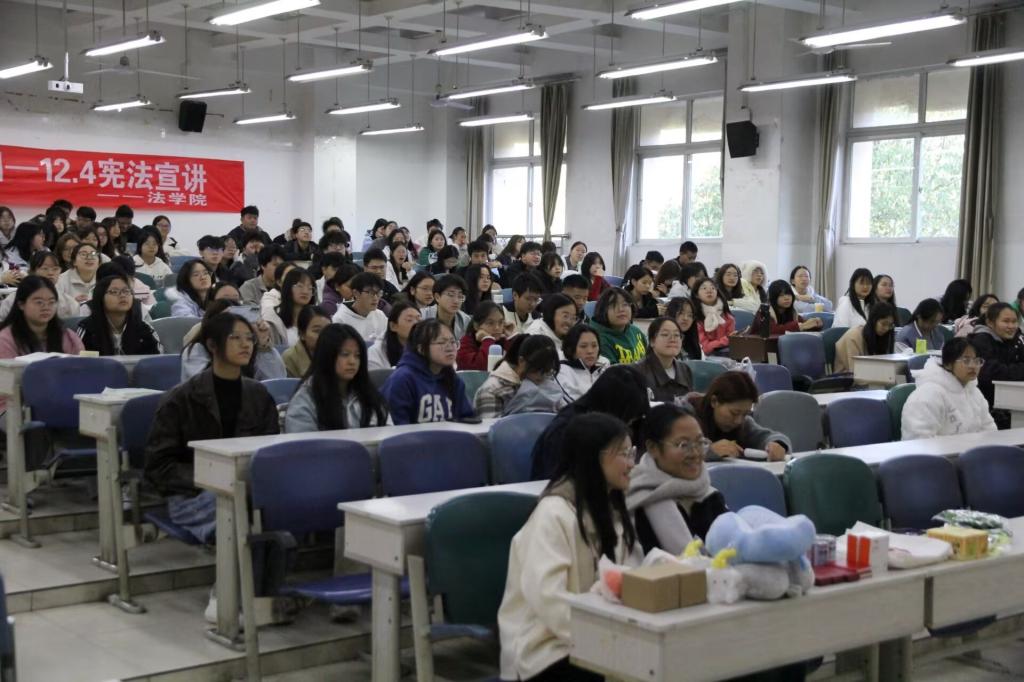 为厚植青年法治信仰,筑牢校园法治根基,法学院宪法宣讲团于11月27日10:00在二教216教室开展“弘扬宪法精神,建设法治校园”主题宪法宣讲活动,本次活动由法学院党委副书记、纪委书记张波与法学院教师郭文梅指导,宪法宣讲团成员青宇、吴军林、张梦雨、谢航主讲,法学院2025级全体学生参加。