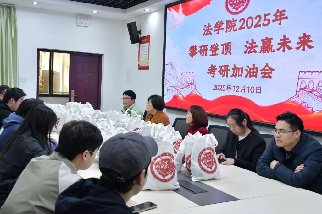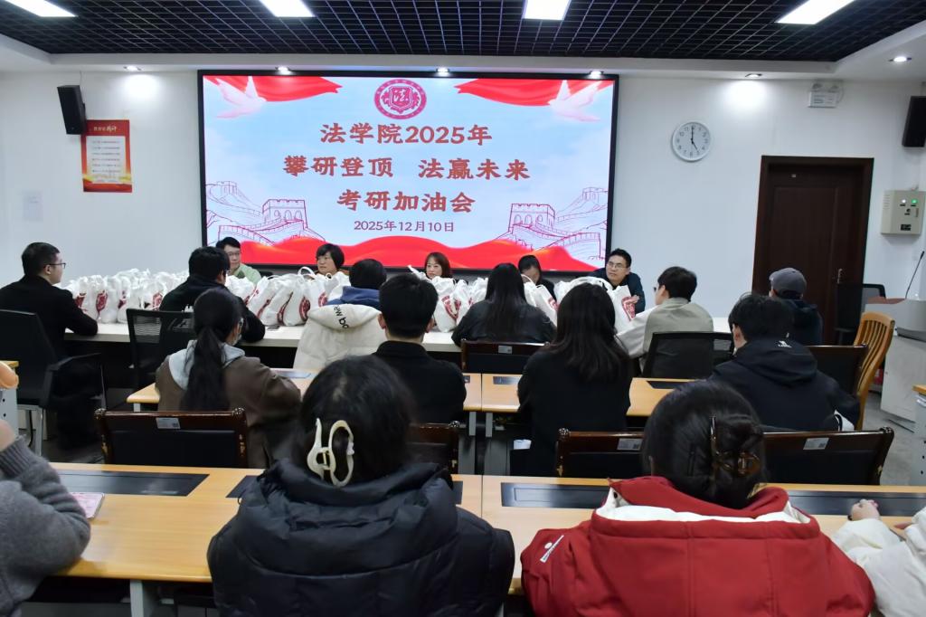 为助力考研学子舒缓备考压力、坚定冲刺决心,12月10日17:00,法学院于凌云楼3-1教室举办2025年“攀研登顶,法赢未来”考研加油会。法学院党委书记张琳、法学院学生科科长兼分团委书记刘沙、2022级辅导员吴军华、2022级法学3班班主任赵艳及2022级行政管理班班主任刘书生应邀出席本次活动。
