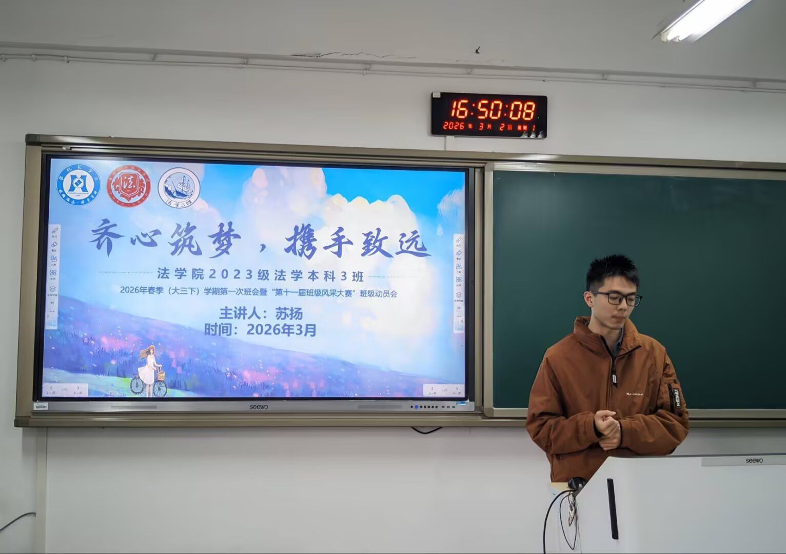 为积极备战攀枝花学院第十一届班级风采大赛决赛,凝聚班级力量、明确备赛方向,3月2日下午,法学院2023级法学本科3班于2-411教室召开班级风采大赛动员会。本次会议由团支书苏扬主讲,班级全体成员参会。 会上,苏扬介绍大赛基本情况。决赛将于4月中下旬举行,法学院设2个晋级名额,评分以风采展演为重点,同时结合班级建设成果、微信投票等进行综合评定。本班确定风采展示采用情景剧与文艺汇演结合形式,融入各类元素,并明确16人备赛组分工。 最后,苏扬对备赛与学业作出统筹安排:3月重点推进备赛查漏补缺及英语、计算机等级考试备考;4月集中排练、冲刺决赛。会议要求全体同学兼顾备赛与学业,严守学分绩点、英语四级、计算机二级、志愿时长等各项要求,做到两手抓、两不误。 此次动员会进一步明晰备赛目标与任务分工,有效凝聚班级向心力,激发了同学们的参赛热情与集体荣誉感,为班级在第十一届班级风采大赛中冲刺优异成绩奠定坚实基础。
