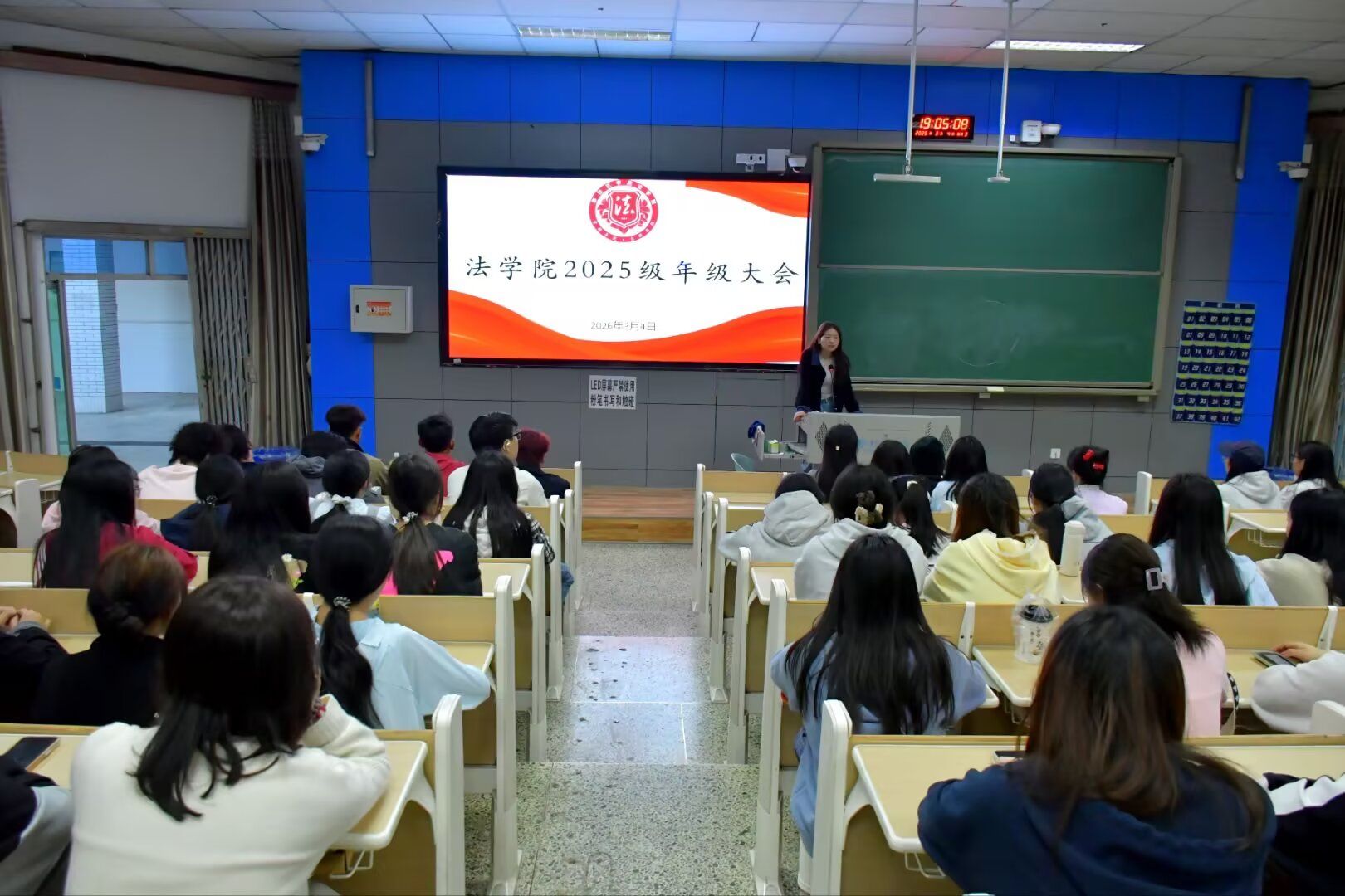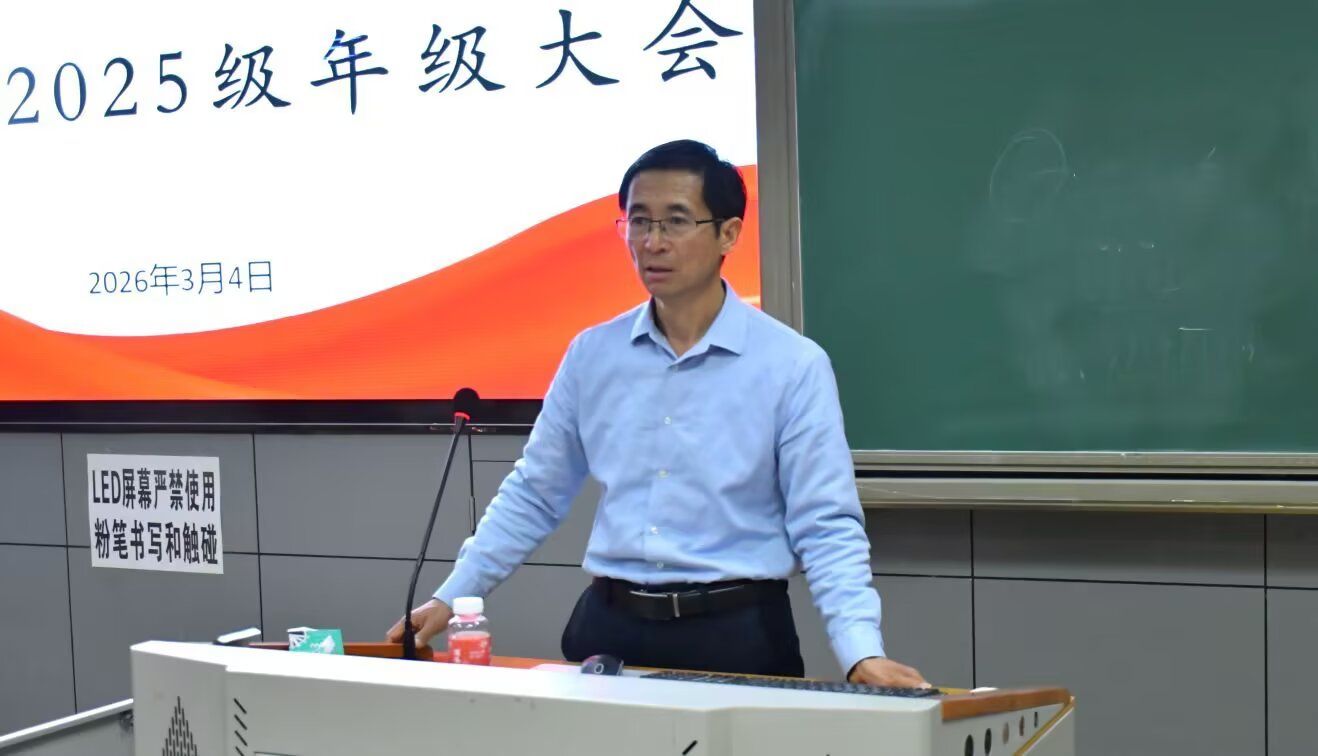 为强化思想引领、塑造优良学风,3月4日19:00,法学院在1-116教室召开2025级年级大会。本次大会由2025级辅导员郭文梅主持,法学院院长杨开华出席会议,2025级全体学生参会。 会议伊始,郭文梅全面复盘新学期班委工作及学生日常管理情况,围绕“尊重”与“规矩”核心要义,号召同学们以勤学奋进为目标,践行服务奉献精神;同时,逐项分析本学期期末成绩、英语四级通过率、整体绩点分布等具体情况,为后续学业提升提供数据支撑。 随后,杨开华结合学业与就业形势发表讲话。他既为成绩落后同学指明改进方向,明确班委职责,要求以严谨态度推进卓越人才班建设;又剖析就业挑战,鼓励学生坚持读书与运动,全力备考四、六级和计算机一级,重视考研规划,潜心钻研专业课。 此次年级大会的召开,不仅是一次学业工作的总结复盘,更是一场思想引领与成长动员的集中教育, 为2025级学生明确发展方向、筑牢学习根基,营造向上向善的良好氛围,助力同学们从适应期平稳迈向蓄力发展期。
