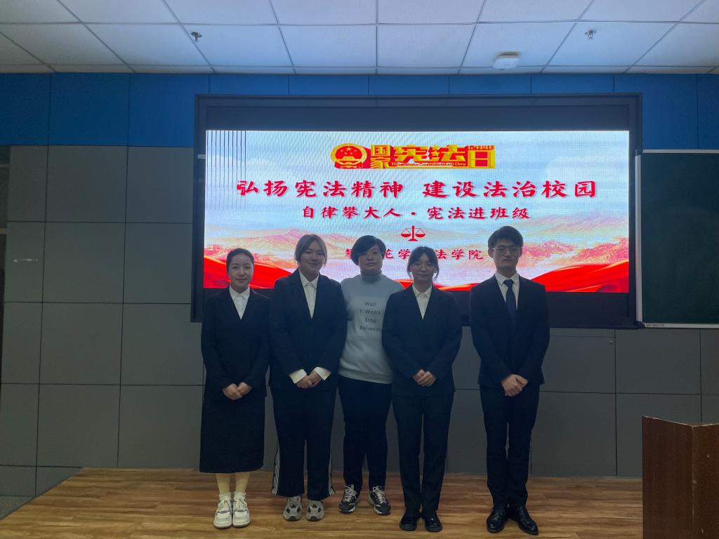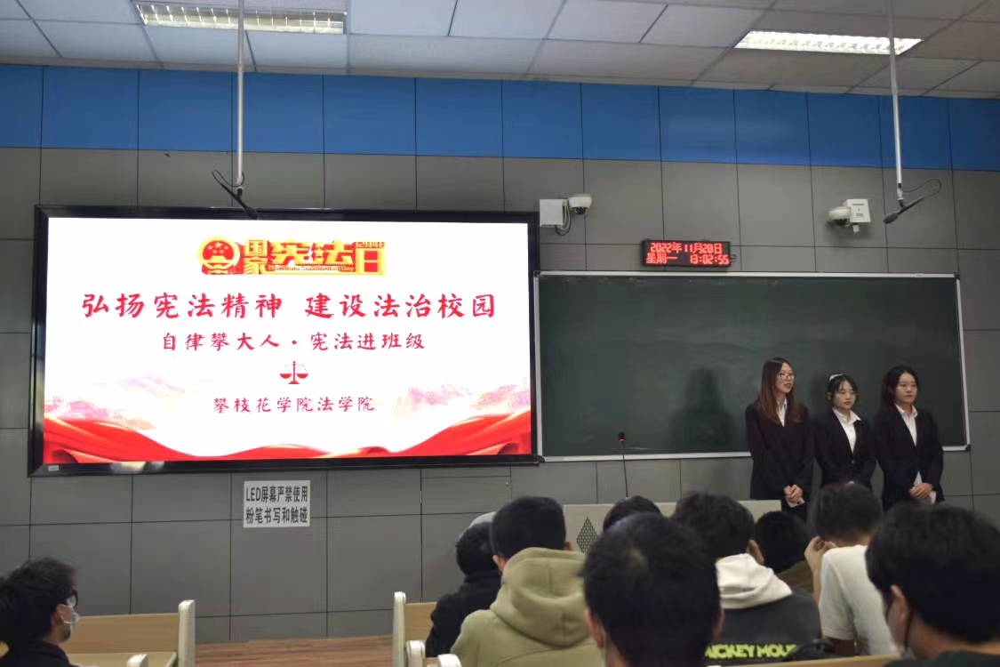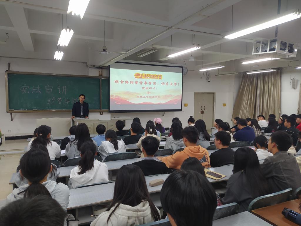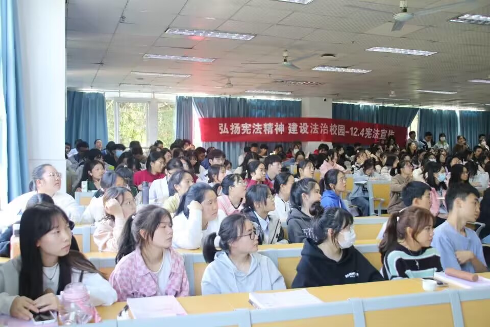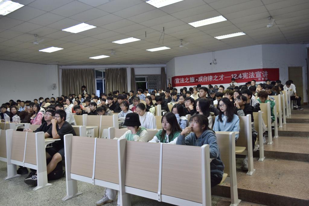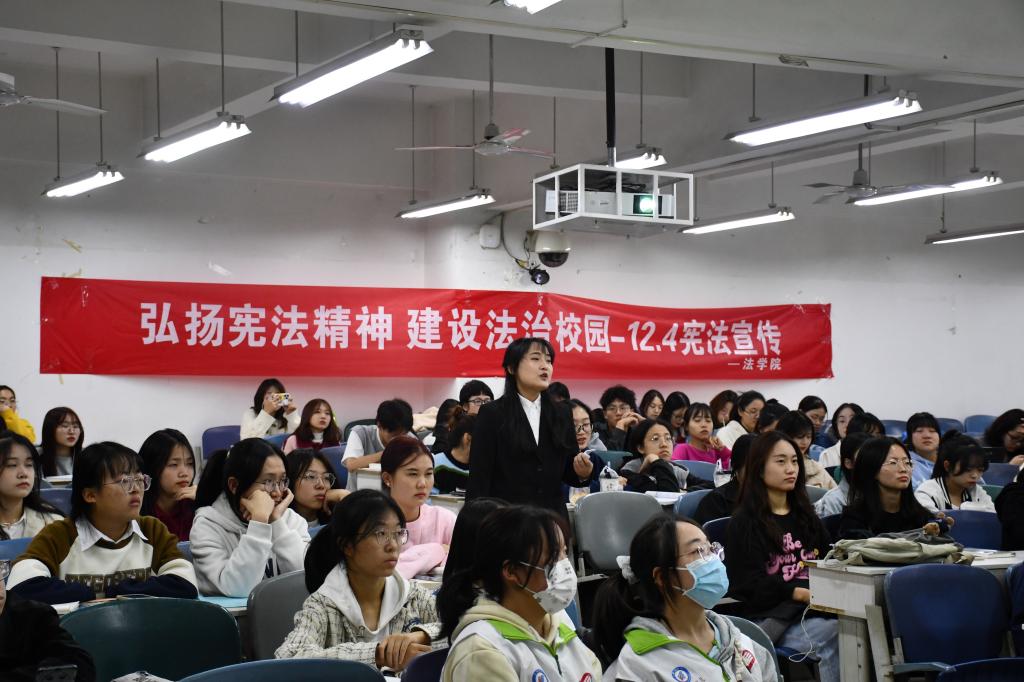 “法立于上,教弘于下。”为进一步增强宪法意识,加强法治教育,强化国家认同,系好大学生的“法治扣子”,把宪法法律教育纳入素质教育体系,法学院党政班子围绕“再进步、新亮点、创品牌”的总体目标,精心策划、周密部署,确保打造更有内涵、更有特色、更具影响力的宪法宣传周教育系列活动,在全院师生集智攻关、聚力同行下,法学院为期一周的“弘扬宪法精神,建设法制校园”法治系列活动于12月4日圆满收官。 ——“行宣法之旅·成自律之才”宪法宣讲活动。“师生法治宣讲团”的组建是我院法治宣讲活动中,不断壮大宣讲力量,推进法治大宣讲专业化的一项重要举措。宣讲团由我院在校青年学生和专业教师组成,学生讲师们以同龄人视角,学习宣传阐释宪法精神,专业教师们着力宪法理论水平,以平实的语言深入浅出阐释了宪法精神与党的二十大精神。宣讲中,首次用情景再现的形式为大家演绎了公民隐私权,这种独特的表达方式引起同学们极大兴趣,现场气氛热烈,高潮迭起,掌声不断。宪法宣讲活动开展一周以来,我院师生法治宣讲团深入课堂宣讲十三余场,20余名学生讲师及专业教师以案释法,宣讲覆盖各二级学院近千人次,得到了与会师生的一致好评。