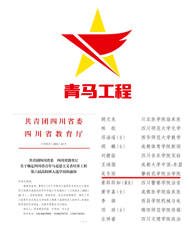 9月21日共青团四川省委、四川省教育厅联合发文,正式发布四川省青年马克思主义者培养工程第六届高校班入选学员名单,经学校推报、资格审查、综合评审等程序,我校法学院吴冬雨同学成功入选四川省“青马工程”第六届高校班。据悉,全省仅41名大学生入选。